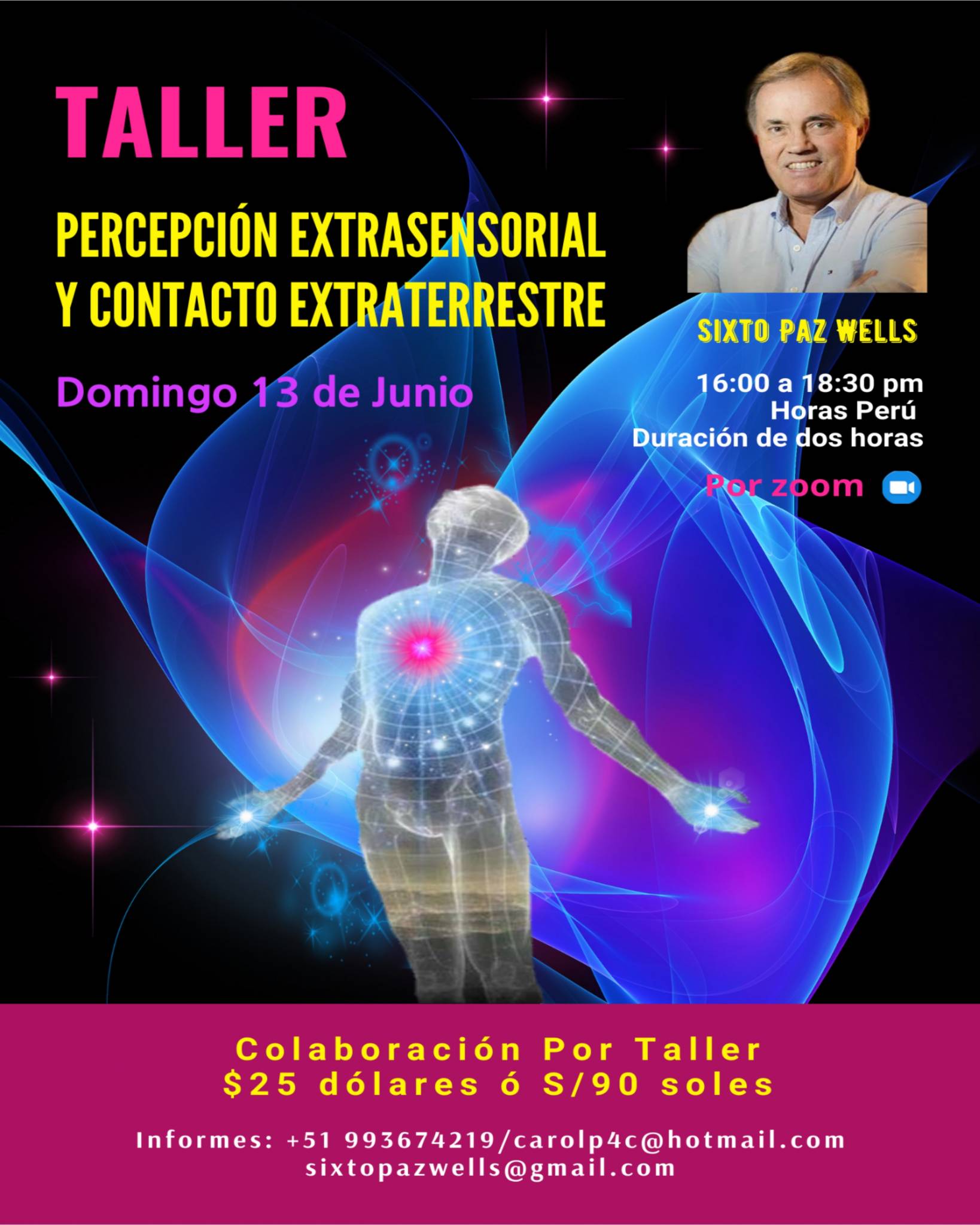 TALLER PERCEPCIÓN EXTRASENSORIAL Y CONTACTO EXTRATERRESTRE SIXTO PAZ WELLS Fecha: 13 de Junio Horario: 16:00 a 18:30 pm horas Perú Previa Inscripción: Colaboración por Taller de: $25 dólares ó S/90